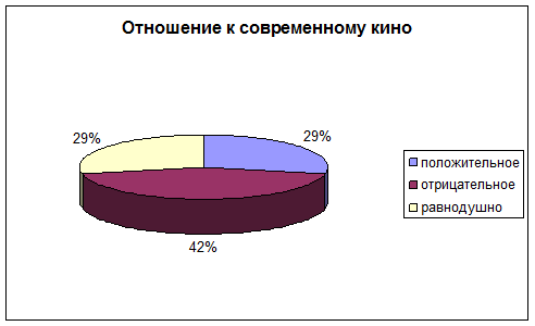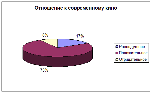 И я возвращаюсь к своему главному вопросу: «Современное кино: вред или польза?». Однозначного ответа я так и не нашла. У каждой возрастной группы и у каждого человека в отдельности свое мнение на этот вопрос. Для группы в возрасте 15-25 современное кино больше польза и позитив, чем вред, а для группы 25-55 лет кино вред и польза примерно 50% на 50%, а вот для группы 55 лет и старше современное кино это однозначно вред. И это нормально что мнения так разделились, ведь люди разные, возраста, социальные факторы, все это различает людей в этом вопросе.
