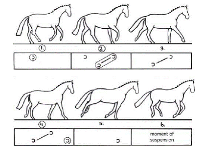 1. Галоп - это аллюр “в три такта” когда, например, при галопе с правой ноги копыта лошади касаются земли в следующей последовательности: левая задняя, затем левая диагональ (одновременно левая передняя и правая задняя), затем правая передняя. Перед следующим тактом галопа следует фаза подвисания, когда все четыре ноги лошади находятся в воздухе.