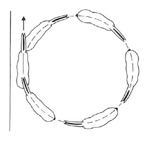 Лошадь остается почти прямой, за исключением легкого постановления в затылке в сторону, обратную направлению движения. Всадник при этом должен видеть угол глаза и ноздрю лошади со стороны постановления. Внутренние ноги лошади перемещаются впереди наружных ног, перекрещиваясь с ними.