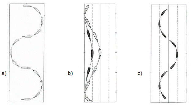 Серпантин состоит из полукругов, соединенных прямой линией. При пересечении центральной линии корпус лошади должен быть параллельным короткой стороне манежа (а). Длина прямой линии, соединяющей полукруги, зависит от их размера. Серпантины с одной петлей по длинной стороне манежа выполняются на расстоянии 5 или 10 метров от длинной стенки манежа (b). Серпантины вдоль центральной линии выполняются между четвертными линиями (с).