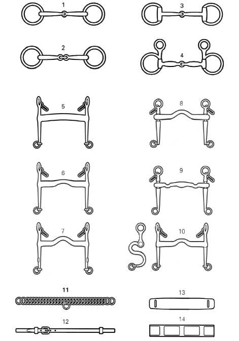 Примечание: Все виды трензелей, указанные как разрешенные в Правилах по троеборью и в Правилах по выездке разрешены для манежной езды в троеборье как на трензельном оголовье, так и как часть мундштучного оголовья. Мундштучное оголовье должно всегда состоять из трензеля и мундштука. Трензель может быть пластиковым или металлическим.