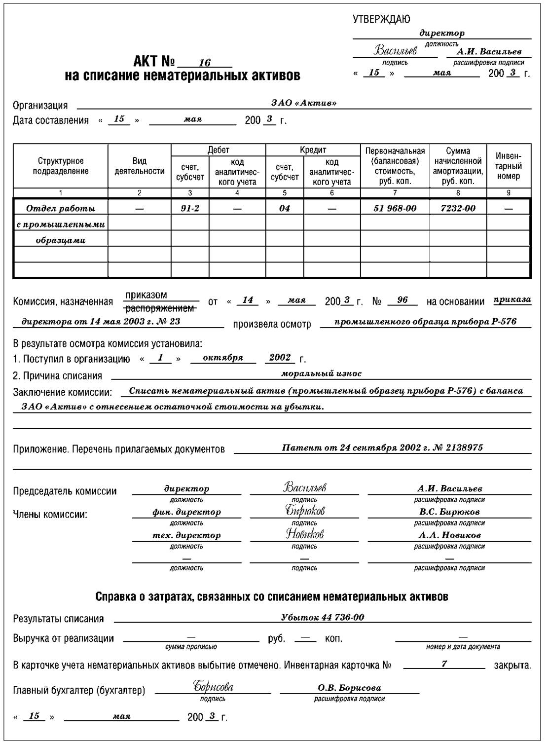 Выбывший нематериальный актив списывают с баланса организации. При этом оформляют акт на списание.