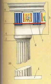 Понятия и термины. Акрополь, фронтон, фриз, ордер, колонны, дорический и ионический ордер, стилобат, стереобат, антаблемент, архитрав, метопа, триглиф, карниз, капитель.