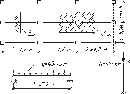 Рис.3. Грузовая площадь и расчетная схема балки и колонны