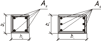 5. По требуемой площади следует принять по сортаменту арматуры (табл. И-1) 4 или 6 рабочих стержней с запасом, расположив их по коротким сторонам сечения (рис.7). Например, примем 4Ø28А400 с Аs=24,63см2 или 6Ø22А400 с Аs=22,81см2