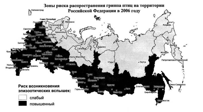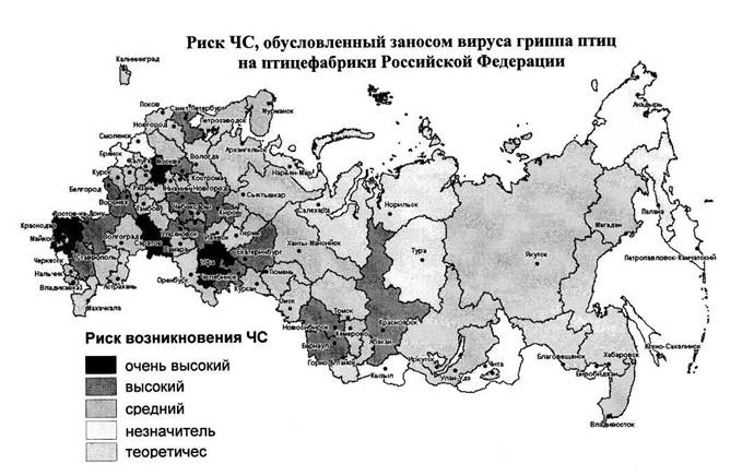 В связи с эпизоотиями высоко патогенного гриппа птиц A (H5N1), зарегистрированными на территории России, в 2006 году в период весенней миграции птиц прогнозируется высокая вероятность разноса вирусов гриппа А (H5N1) по всей территории Российской Федерации. Не исключен занос новых, возможно более патогенных, вариантов вируса Н5 из стран Юго-Восточной Азии на территорию Сибирского, Уральского и Дальневосточного федеральных округов. На угрожаемых территориях повышается риск возникновения эпизоотии на птицеводческих комплексах, основная доля которых придется на Южный и Приволжский федеральный округ (потери - до 75 млн. голов птицы, а также в крестьянских и фермерских хозяйствах преимущественно Южного и Сибирского федеральных округов (потери - до 150 млн. голов птицы). Общий объем ущерба для экономики может составить около 79 млрд.руб.