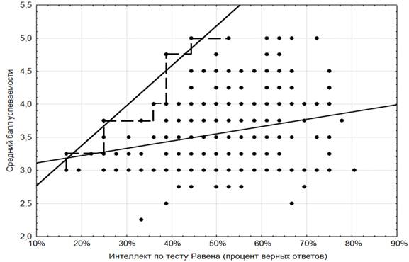 Важно отметить, что этот эффект ярко проявляется на материале учебной успеваемости по алгебре, успеваемость же по русскому языку не демонстрирует подобной зависимости. Вероятно, объяснение этих различий лежит в особенностях интеллектуальных ресурсов, необходимых для успешного изучения русского языка, при освоении которого невербальный интеллект, измеряемый тестом Равена, играет меньшую роль, чем при освоении математики. Возможно также, что система требований предъявляемых к школьникам при освоении русского языка и используемых при оценке их достижений в меньшей мере предполагает существенное задействование интеллектуальных ресурсов.