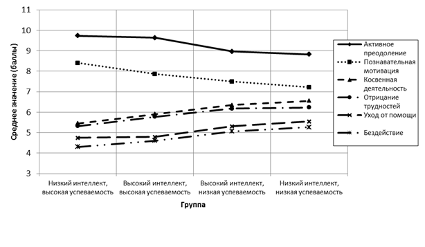 Также показательны различия между группой с низким интеллектом и высокой успеваемостью и группой с высоким интеллектом и низкой успеваемостью, в которых достижения не соответствуют однозначно их уровню интеллекта. Для школьников с высоким уровнем интеллекта и низкой успеваемостью, учеба выступает как относительно простая деятельность и соответственно недостаточно мотивирующая с точки зрения возможностей роста компетентности. Это приводит к тому, что снижается стремление использовать продуктивные стратегии реагирования на трудности (или сами трудности не воспринимаются как таковые в силу изначальной легкости учебных заданий). Различия между ними являются значимыми нескольким стратегиям преодоления трудностей, что свидетельствует о роли мотивационных переменных в успеваемости, несмотря на уровень интеллекта. Представители первой группы значимо чаще прибегают к такой продуктивной копинг-стратегии, как активное преодоление трудностей и реже – к стратегиям отрицание и косвенная деятельность (все p<0,05).