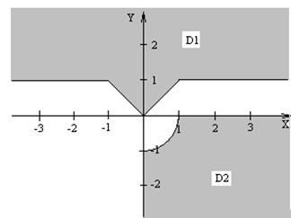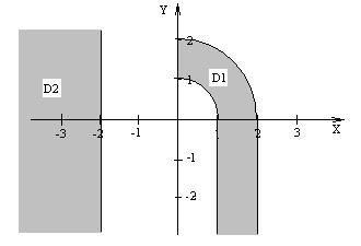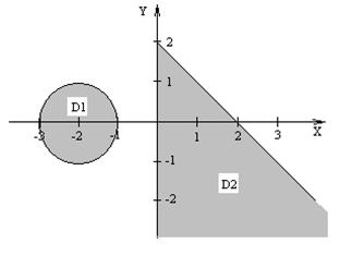 | Даны три целых числа A, B, C. Определить значения переменных X, Y, Z. Х = min(A+В,В+С, А+С), Y = max(A*В,В*С, А*С)-2, Если С>1, то Z=Y-X, иначе Z=X+Y. U определяется как функция X и Y, ее значение зависит от принадлежности переменных Х и У заштрихованным частям плоскости. Разработать программу, которая по введенным пользователем целым числам А, В и С определяет значения X, Y, Z и U. Вывести значения переменных А, B, С, X, Y, Z и U на экран дисплея, сопровождая пояснительным текстом. Пояснительный текст должен содержать сведения о том, какой области (D1, D2 или ни D1 ни D2) принадлежат переменные Х, У и по какой формуле при этом определялось значение переменной U. |