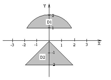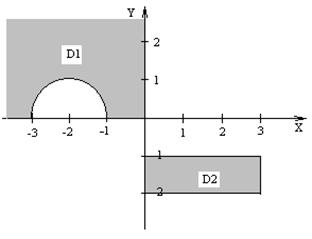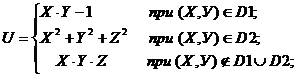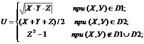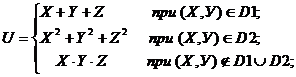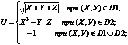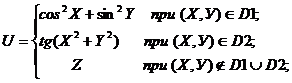 | Даны три целых числа A, B, C. Определить значения переменных X, Y, Z. Если (А+В+С) делится на 3 с остатком 1, то X=A-B, Y=B-C, Z=A-C; если с остатком 2, то X=A+B, Y=B+C, Z=A+C, если без остатка, то X=A, Y=2*B, Z=3*C. U определяется как функция X и Y, ее значение зависит от принадлежности переменных Х и У заштрихованным частям плоскости. Разработать программу, которая по введенным пользователем целым числам А, В и С определяет значения X, Y, Z и U. Вывести значения переменных А, B, С, X, Y, Z и U на экран дисплея, сопровождая пояснительным текстом. Пояснительный текст должен содержать сведения о том, какой области (D1, D2 или ни D1 ни D2) принадлежат переменные Х, У и по какой формуле при этом определялось значение переменной U. |