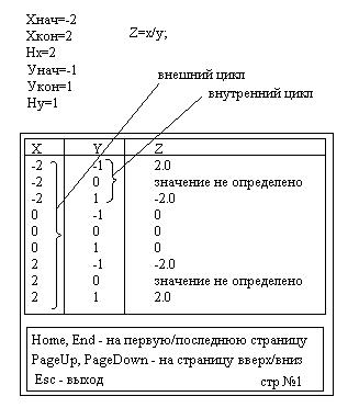 Составить программу расчета значений функции двух переменных z=f(x,y) с использованием операторов цикла. Значения переменных х и y изменяются соответственно от Xнач до Хкон с шагом hx (внешний цикл) и от Унач до Укон с шагом hy (внутренний цикл). Значения Хнач, Хкон, Нх, Унач, Укон, Ну вводятся с клавиатуры (вещественного типа).