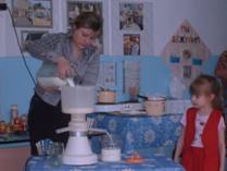 Воспитатель. Давайте повторим, из чего делают сыр? (Из творога). Давайте посмотрим, готов ли творог у Коли?