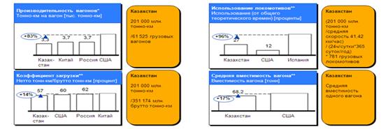 Сравнительный анализ производительности грузовых вагонов АО «НК «КТЖ» (измеряемой в грузовых тонно-километрах нетто/на грузовые тонно-километры брутто) показывает, что АО «НК «КТЖ» опережает Европейские компании, но значительно отстаёт от России, Китая и США