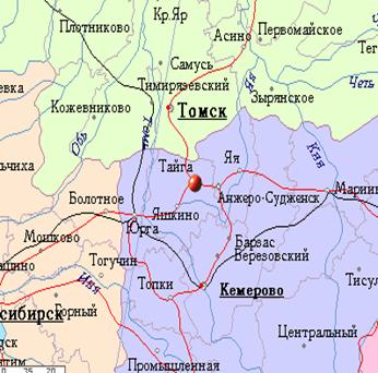 Тайга — город областного подчинения расположен на северо-западе Кемеровской области. Находится в котловине. Климат - резко континентальный с коротким летом и продолжительной зимой. Первые постройки появились в 1895 году. Возникновением Тайга обязана целиком прокладке Великого Сибирского парового пути. Первоначально станцию называли и в быту, и в печати Томск - Таежный, позднее — Тайга, станция Тайга, город Тайга. Официально Тайга признана населенным пунктом Томской губернии 22 июля 1896 года (день рождения города совпадает с приходом первого поезда из Тайги в Томск). |