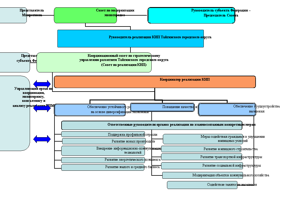 Ответственным исполнителем действий по реализации комплексного плана является администрация Тайгинского городского округа, которая обеспечивает своевременную подготовку предложений по объемам и условиям предоставления муниципальному образованию средств федерального и регионального бюджетов для реализации программы, взаимодействует с органами исполнительной власти Кемеровской области и осуществляет контроль за ходом реализации комплексного плана.