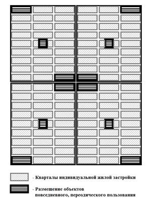 Размещение объектов повседневного, периодического пользования в индивидуальной, блокированной жилой застройке, следует предусматривать с учетом равной удаленности от отдельных планировочных элементов в границах одного района.