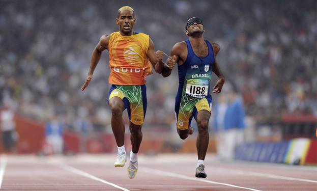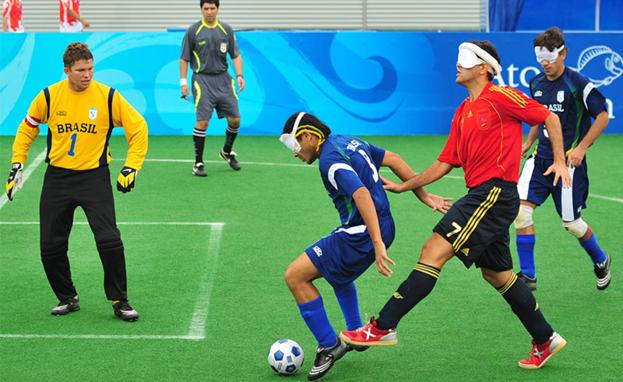12.Футбол 5х5 - игра для атлетов с ухудшенным зрением, с возможностью одного зрячего игрока как вратаря. Игра длится 50мин. Правила те же, как в футболе, только мяч шумит, когда он перемещается и вратарь может выступать как гид в течение игры(он зрячий) , остальная часть команды использует повязки на глазах, размер поля меньше. Дебютировал на Паралимпийских играх в Афинах 2004г.