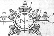 Рис. 6.5. Варианты конструкции фазы гибкого токопровода: 1 - провод; 2 - стальные скобы; 3 - скобы из алюминиевого сплава; 4 - несущий провод |