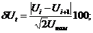 размахом изменения напряжения, % - отношением разности между следующими друг за другом экстремумами (или экстремума и горизонтального участка) Ui и Ui+1 огибающей амплитудных значений напряжения к номинальному значению напряжения