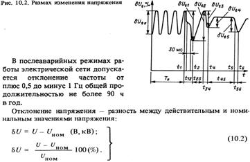 Допустимые значения колебаний напряжения определяются по кривым на рис. 10.1 в зависимости от частоты их повторения или интервала между последующими изменениями; кривая получена экспериментальным путем исследования реакции человека на периодические мигания осветительных установок. Степень раздражения органов зрения человека зависит от значений и частоты миганий светильника. Наиболее неприятный психологический эффект, утомление зрения и организма человека вызывает мигание света с частотой 3–10 Гц, поэтому допустимые колебания напряжения в этом диапазоне минимальны: не более 0,5% в СНГ, 0,2-0,3% во Франции, США, Японии. Отклонения и колебания напряжения вызывают ухудшение работы электроприемников.
