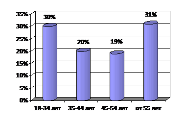 Соотношение возрастных групп респондентов распределилось следующим образом: от 18 до 34 лет – 30%, от 35 до 44 лет – 20%, 45-54 года – 19%, от 55 лет –31%.