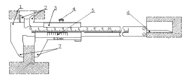 Штангенциркуль ШЦ—1 применяют для измерения наружных, внутренних размеров и глубин с величиной отсчета по нониусу 0,1 мм. Штангенциркуль имеет штангу 1, на которой нанесена шкала с основными миллиметровыми делениями. На одном конце этой штанги имеются измерительные губки 2 и 7, а на другом конце линейка 6 для измерения глубин. По штанге перемещается подвижная рамка 3 с губками.