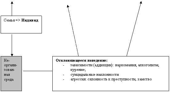 Неорганизованная среда предполагает отсутствие полноценных коммуникативных контактов (поверхностное межличностное общение), неорганизованный досуг, принадлежность к молодежным контркультурам, атрибутом которых является употребление наркотиков; отказ от общепринятых ценностных ориентиров.