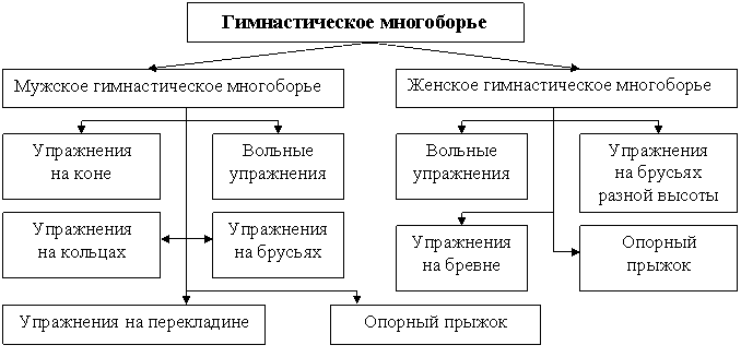Программа соревнований по гимнастике должна включать несколько видов многоборья (не менее трех). Это могут быть традиционные виды мужского и женского гимнастического многоборья (схема 4), а также комбинации акробатических элементов, комплексы ОРУ, комплексы утренней гимнастики, упражнения ОФП (подтягивания, отжимания и т. д.). Главное, предусмотреть перевод количественных показателей (м, сек, кол-во повторений) в баллы.