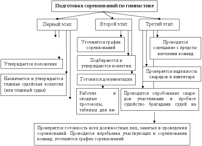 Подготовительная работа к предстоящим соревнованиям, независимо от их масштаба, должна проводиться задолго до их начала. Всю работу целесообразно разделить три этапа (схема 6), при этом часть работы осуществляется организацией, проводящей соревнования; другая часть – главной судейской коллегией.