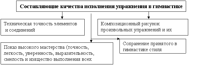 Критерием спортивного мастерства в гимнастике является качество исполнения упражнения (схема 8). Характерными особенностями соревнований по гимнастике являются методика судейства и система оценки исполнения комбинаций. В отличие от других видов, где оценка выступления может основываться на объективных критериях, в гимнастике оценивание выступления усложняется тем, что носит субъективный характер.