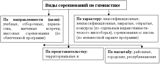 В зависимости от цели, формы, масштаба и характера соревнований соревнования по спортивной гимнастике могут быть различных видов (схема 2).