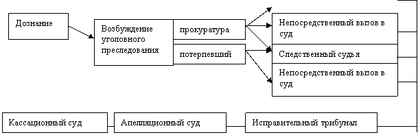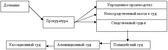 Стадии уголовного процесса Франции: 1) дознание; 2) возбуждение уголовного преследования; 3) предварительное следствие – досудебные стадии; 4) судебное разбирательство и 4) пересмотр или обжалование судебного решения.