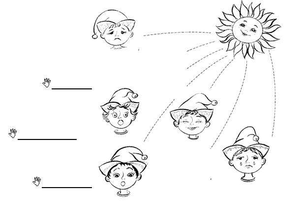 8. На рисунках – лица гномов. Дайте каждому из них имя, которое соответствуют чувству, выраженному на их лицах. Подпишите, пожалуйста, это имя-чувство.