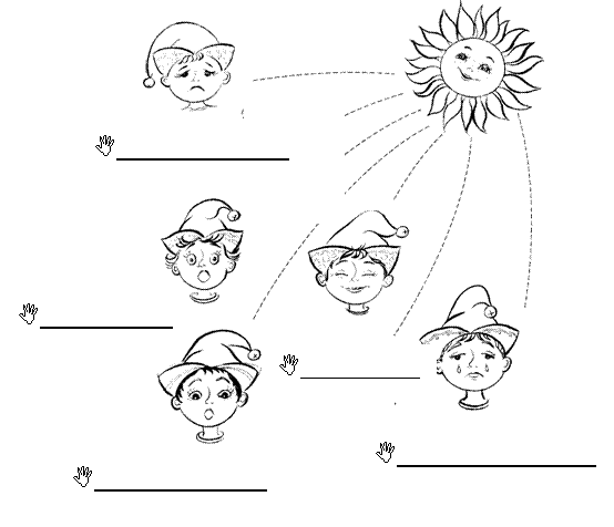 8. На рисунках – лица гномов. Дайте каждому из них имя, которое соответствуют чувству, выраженному на их лицах. Подпишите, пожалуйста, это имя-чувство.