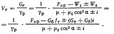 где Fкр — сила тяги на крюке при первой передаче трактора; Gб, Gт, Gr— вес соответственно бульдозера, трактора и перемещаемого грунта; fr – коэффициент сопротивления перекатыванию трактора; µ, µ1 — коэффициенты трения грунта по грунту (0,7...1,2) и грунта по металлу (0,4...0,6); i — преодолеваемый уклон пути; а — угол наклона рабочей поверхности отвала к горизонту, примерно равный углу резания грунта; γР — плотность грунта в рыхлом состоянии перед отвалом.