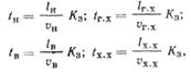 где lн, lВ, lг. х. , lX. X — длины участков пути набора, выгрузки, груженого и порожнего хода, м; Vн, Vв, Vг. х., Vх. х. — соответствующие элементам цикла скорости движения тягача при наборе, выгрузке, груженом и порожнем ходе, выбираемые в соответствии с тяговыми сопротивлениями на различных участках пути движения скрепера, м/с; КЗ — коэффициент, учитывающий увеличение продолжительности элементов цикла за счет разгона при трогании с места, замедления при остановке и переключении передач, пробуксовке движителей по грунту.
