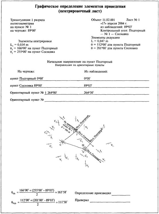 Линейные элементы центрировки между точками С и J и редукции —между точками С и V измеряют на центрировочном листе. Угловые элементы центрировки qс и редукции qr строят в точках J и V между С и двумя направлениями, прочерченными на наблюдаемые пункты.