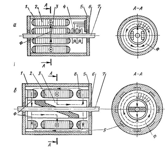 Рисунок 1.9 – Схематическое изображение конструкций контактного (а) и бесконтактного (б) явнополюсных сельсинов: