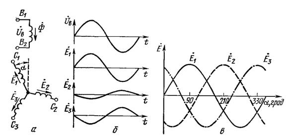 Если на обмотку возбуждения сельсина подать переменное напряжение UВ (рис. 1.10), то протекающий по ней ток создает пульсирующий магнитный поток Ф, направление которого будет совпадать с осью обмотки возбуждения. Этот поток в зависимости от положения ротора наводит в фазных обмотках синхронизации различные по величине э. д.с. (рис. 1.10 б, в)