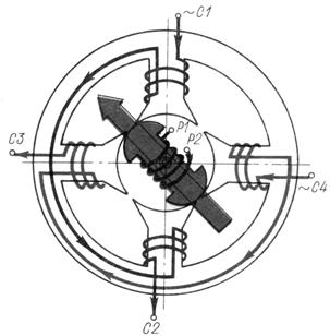 Статор вращающегося трансформатора (рис. 1.11) имеет две однофазные обмотки С1-С2 и СЗ-С4, сдвинутые на 90° относительно диффузора. Ротор также имеет две обмотки, включенные последовательно (на рисунке для упрощения показана одна обмотка Р1-Р2). Магнитопровод изготовляют из листов электрической стали или пермоллоя. На роторе и статоре равномерно расположены пазы, в которых размещены взаимно перпендикулярные обмотки. Первичными обмотками вращающегося трансформатора (ВТ) чаще всего являются обмотки статора, а вторичными – обмотки ротора, который связан с перемещающимся элементом. При повороте ротора, который собственно и является первичным датчиком, с него снимается синусоидальное напряжение.