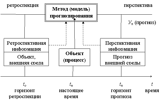 На схеме (рис. 1) показано, что для получения прогноза (уп) какого-либо параметра (у) объекта или процесса необходимо иметь определенную модель прогнозирования, которая использует ретроспективную (прошлую) информацию за определенный интервал времени в прошлом (период наблюдения или глубина ретроспекции), информацию о параметре «у» в настоящий момент времени, иногда прогнозную информацию о внешней среде. Точность и достоверность получаемого прогноза уп будет зависеть от объема, точности и достоверности исходной информации, корректности применяемого метода (модели) и глубины прогноза.