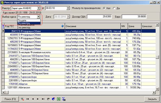 Полный реестр можно посмотреть в Меню – Справочники – Реестры (рис.5) . Тип реестра выбираем - «Зарег. цен ЖНВЛС». Цены в реестре могут быть указаны в рублях или в валюте (колонка «Цена вал»). Если цена зарегистрирована в рублях, то в колонке «Валюта» стоит значение RUR, если же в валюте, то в колонке «Валюта» стоит одно из двух значений EUR(евро) или USD(доллар). Колонка «Цена» (зарегистрированная цена в рублях) для «валютных» товаров заполняется пересчетом Цена вал*Курс валюты. Первоначально значения текущих курсов доллара и евро берутся из обновления с реестром, но можно выбрать курс валюты на определенный день, тогда данные в колонке «Цена» пересчитываются в соответствии с курсом на указанную дату.