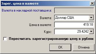 Если установить галочку «Пересчитать зарегистрированную цену в рублях» и нажать кнопку ОК, то в складской карточке заполнится зарегистрированная цена производителя.