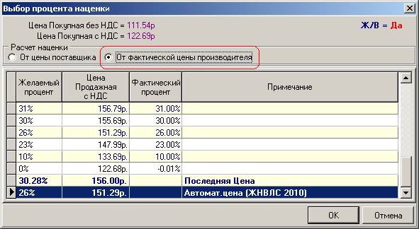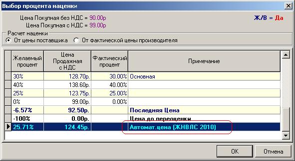 Для просмотра цены, рекомендованной ценообразованием, надо нажать на кнопку «процент наценки» и выбрать цену «Автомат. цена (ЖНВЛС 2010)» (Рис. 12)
