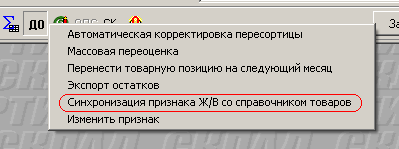Для этого запускаем отчет Меню – Отчеты – Ведомость - По остаткам – отчет «Несовпадение признаков ЖВ». Если есть несоответствие признаков ЖВ, то просматриваем позиции и приводим в соответствие признаки ЖВ либо вручную, открывая каждую складскую карточку, либо через дополнительный пункт в окне «Просмотр и корректировка остатков» – «Синхронизация признака Ж/В со справочником товаров» (Рис.8). Синхронизация признака проводится для списка позиций, видимых на экране, т. е. с учетом наложенных фильтров.
