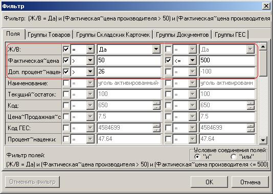 Если цены производителей уже заполнены, необходимо выявить позиции, которые попали в превышение наценки. Для этого воспользуемся тем же самым расширенным фильтром, но с другими параметрами.