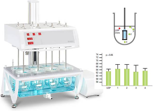 Рисунок – Прибор для проведения теста «Растворение» ERWEKA DT 720 – слева, справа на рисунке изображен сосуд и отмечены пять точек отбора проб, наилучшая воспроизводимость результатов достигается в точке «USP zone».