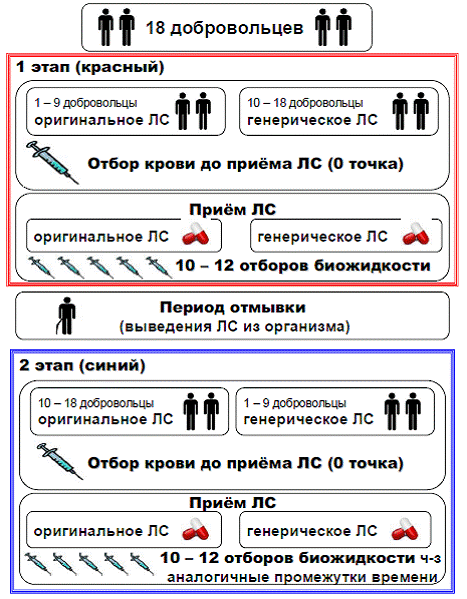 Исследование биологической эквивалентности включает в себя назначение тестируемого и эталонного препаратов в два приема на добровольцах. Промежуток времени между приемом первого и второго лекарственных средств должен составлять не менее шести периодов полувыведения ЛС из организма. Тестируемые лекарственные средства обычно принимаются натощак, запиваются стандартным объемом негазированной воды (150 мл), завтрак может быть получен не ранее чем через четыре часа после начала исследования. За двое суток до начала исследований и в период проведения испытуемые не должны получать другие лекарственные средства, в течение суток до исследования и на всем его протяжении соблюдается строгая диета, исключающая жирную и жареную пищу, напитки, содержащие кофеин, и определенные виды фруктовых соков (например, грейпфрутовый сок). При этом к водному и пищевому режиму предъявляются требования, указанные в протоколе исследования.