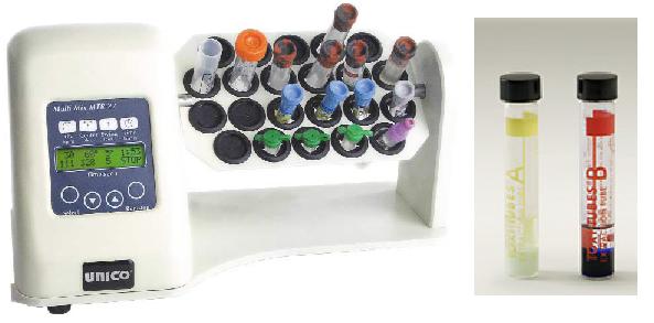 Рисунок – Устройство для перемешивания содержимого пробирок с программируемым таймером и скоростью вращения, а также пробирки с буферными растворами и органическими растворителями для проведения экстракции веществ основного и кислотного характера.