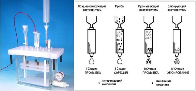 Рисунок – Камера для проведения твердофазной экстракции и четыре последовательных стадии очистки проб